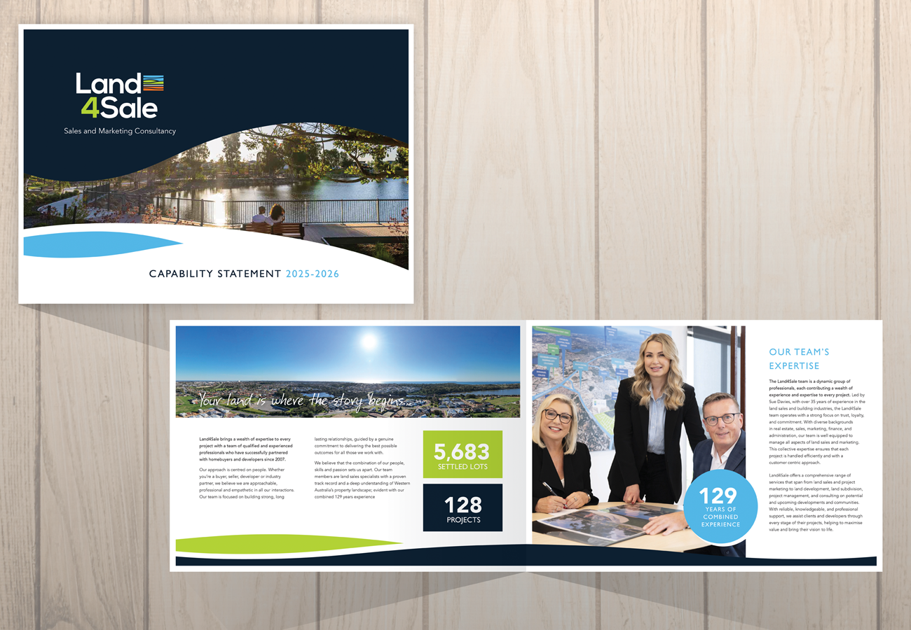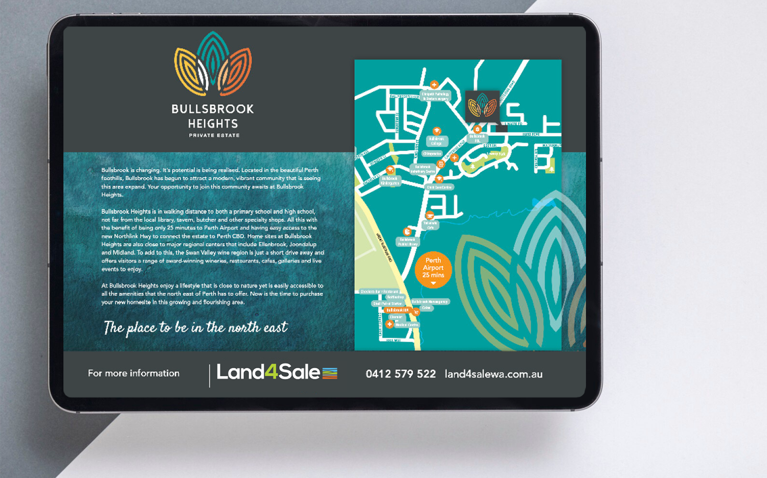 Over many years, we’ve partnered with Land4Sale, a well-established Western Australian property group, to bring clarity, consistency and creativity to their brand communications. Our work has spanned a full range of print collateral — from estate brochures and lot signage to maps, flyers and press advertising — each designed to support Land4Sale’s mission of connecting people with land and lifestyle across WA. Grounded in a strong understanding of the brand’s values and target markets, our approach has focused on delivering purposeful design that not only looks great but communicates clearly and effectively. Whether launching a new estate or supporting ongoing campaigns, our role has been to ensure every touchpoint aligns with Land4Sale’s identity and speaks to the aspirations of buyers. It’s a collaboration built on trust, and an example of how considered marketing, brand and communication design can drive real engagement.